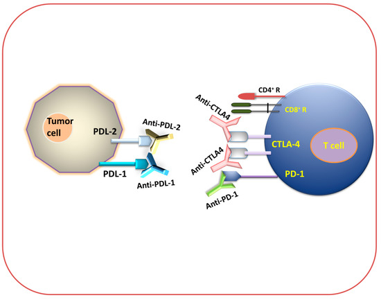 Figure 3 and Figure 4 show that different immune checkpoints are inhibited by different antibodies such as anti-PDL1, anti-PDL2, anti-PD1, anti-CTLA4, anti-lymphocyte-activation gene 3 (anti-LAG3), and anti-T cell immunoglobulin and mucin domain-containing protein 3 (anti-TIM-3), which are involved in the generation of an antitumor immune response against cancerous cells.