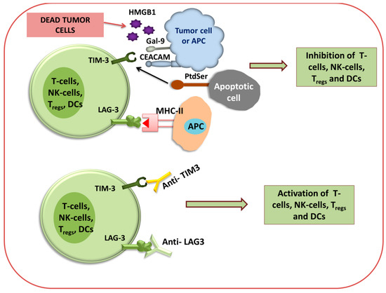 It has been illustrated that the binding of LAG3 to the primary ligand MHC class II results in the repression of effector T cells like PD-1 and increases the regulatory T cell activity, thereby supporting tumor growth [119]. By binding to the MHC-II molecule, LAG3 negatively regulates the CD4+ T cells’ and CD8+ T cells’ functions and their response. TIM-3 is constantly expressed on DC cells, particularly on DC1 cells in tumors. Also, it facilitates cross-presentation of the antigen and licenses CD8+ T cells [120,121]. Most terminally dysfunctional subsets of CD8+ TILs are marked by TIM-3 [122]. Clinical trials demonstrated that anti-LAG3 antibody administration can enhance immune response [123]. Co-inhibitory receptor TIM-3 expressed on IFN-γ-secreting CD4+ T cells and CD8+ T cells, Treg cells, NK cells, and monocytes. TIM-3 plays an important role in the regulation of type-1 T-helper cell (Th-1)-mediated immune response, and also regulates the signaling of various cytokines (TNF-α and IFN-γ) plus their release from T cells [123]. Some studies reported that in renal cell carcinoma, a higher expression of TIM-3 was also detected on CD204+ TAMs and tumor cells [124]. Four different ligands that bind to TIM-3 are galectin-9, phosphatidylserine (PtdSer), high-mobility group protein B1 (HMGB1), and carcinoembryonic antigen-related cell adhesion molecule-1 (CEACAM) [125]. As TIM-3 has a negative impact on immune regulation, the blockade of TIM-3 inhibition using an antibody may induce an antitumor immune response against some cancers, such as colorectal cancer, in which anti-CTLA-4 and anti-PD-1 antibodies were not effective [126].