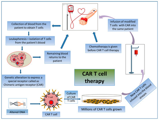 CAR T cell therapy is an adoptive T cell transfer (ACT) therapy whereby killing cancerous cells does not involve MHC molecules but rather the patient’s T-lymphocytes. CAR T cell therapy encompasses the exogenous selection, modification, expansion, and re-infusion of modified T cells into the patient’s body (Figure 5). CARs are generated by collecting patient T cells via a process known as apheresis, and engineered cells are reintroduced after a preparative regimen. Here, T-lymphocytes are collected from their peripheral blood and then are genetically modified ex vivo via the single-chain variable fragment (scFv) antigen recognition domain to express CD19-specific CARs. Thus, the reinfused modified T cells seek out and destroy the tumor cells expressing CD19 in the patient. By this mechanism, modified T cells raise an immunogenic niche inside the patient’s body [127]. These are used specifically for treating patients with advanced-stage B-cell malignancies [128].