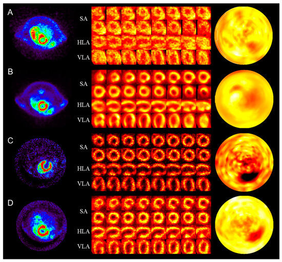 Myocardial infarction model images of various radiopharmaceuticals: (A) 64Cu-pyruvaldehyde-bis(N4-methylthiosemicarbazone); (B) 18F-fluoro-deoxy-glucose; (C) 99mTc-hexakis-2-methoxyisobutylisonitrile; (D) 201Tl. The first column shows positron emission tomography/single photon emission computed tomography myocardial image. The second column shows the splash images SA, HLA, and VLA. The third column shows the polar map image. SA, short axis view; HLA, horizontal long axis; VLA, vertical long axis.
