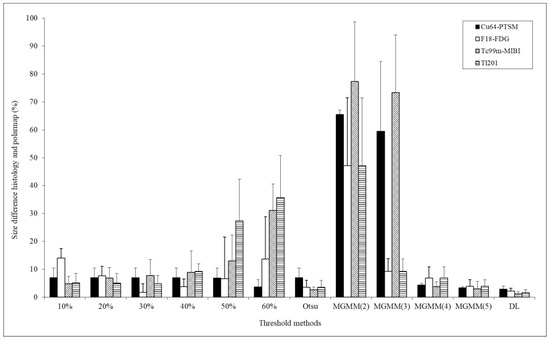 Figure 5 shows the comparison of the evaluated infarct size using various methods. The threshold value is set using the predefined absolute threshold value method and the MGMM method on the generated polar map for the evaluation of MI size in PET/SPECT images [34]. The histologically stained H&E area used as the standard size of the MI area was 15%. The infarct sizes using the predefined 40% threshold value of 64Cu-PTSM, 18F-FDG, 99mTc-MIBI, and Tl polar map were 0%, 0%, 8.71%, and 3.26%, respectively. The infarct size using the adaptive threshold values with the MGMM algorithm of 64Cu-PTSM, 18F-FDG, 99mTc-MIBI, and 201Tl polar map were 13.03%, 14.26%, 13.8%, and 8.78%, respectively.