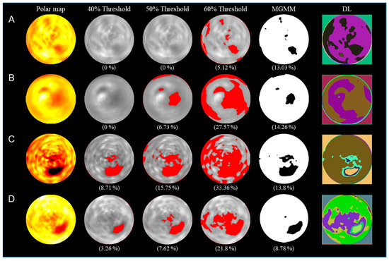 In this study, we evaluated the MI area in polar maps obtained using multimodal imaging for quantitative assessment of MI size using histogram-based pixel threshold methods, including multi-Gaussian mixture model (MGMM) and DL-based unsupervised segmentation methods.