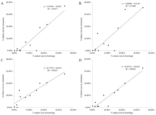 The correlation analysis of infarct size determined by histology and various threshold value methods: (A) 40% absolute threshold value; (B) Otsu algorithm; (C) MGMM; (D) DL segmentation method.