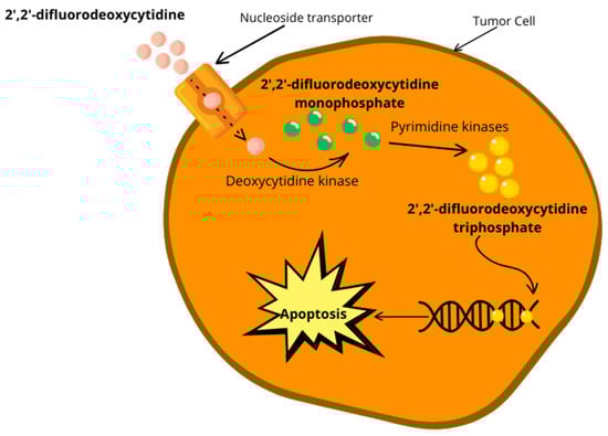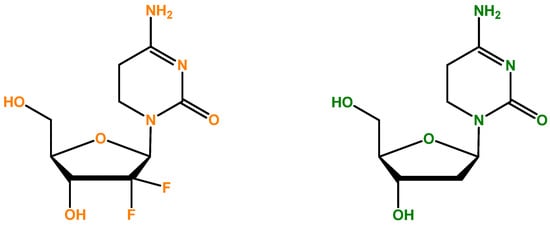 Gemcitabine (dFdC: 2′,2′-difluoro-2′-deoxycytidine)’s chemical formula [84] is represented on the left side. On the right, 2-deoxycytidine (cytosine deoxyribonucleoside) is illustrated, and there is competition between gemcitabine and this nucleoside. It is important to mention that DNA is formed in part by four different nucleosides, and the cytosine deoxyribonucleoside is one of them.