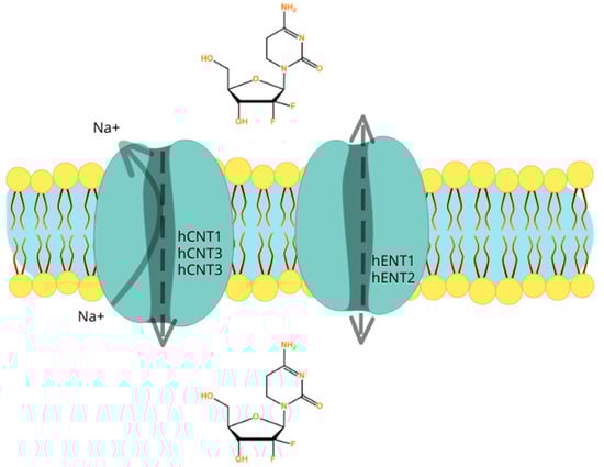 Gemcitabine is highly hydrophilic, therefore passive diffusion across the lipid bilayer of the hydrophobic cellular plasma membrane is not rapid and not significant. To effectively enter into the cells, gemcitabine needs physiologic nucleoside transporter proteins to pass through the plasma membrane [85]. There are two groups of transporter proteins: equilibrative transporters and concentrative transporters. The first group are the bi-directional human equilibrative nuclear transporters (hENTs) and they can be found in almost every cell type, and hENT1, as well as hENT2, can mediate gemcitabine uptake in the direction of the concentration gradient. The second group is the human concentrative nucleoside transporters (hCNTs), which are antiporters that extrude sodium during the import of nucleosides. Human concentrative nucleoside transporter 1 (hCNT1) and hCNT3 are the two recognized concentrative nucleoside/sodium co-transporters in humans, which can transport gemcitabine into a cell using the energy gained from Na+ extrusion. Transporter proteins are capable of functioning against the substrate concentration gradient. However, the human concentrative nucleoside transporter 3 (hCNT3) exhibits a lower level of selectivity compared to the other concentrative transporters in terms of receiving pyrimidine and purine nucleosides. In contrast, hCNT1 and hCNT2 display a more efficient reception of pyrimidine and purine nucleosides, respectively. Despite its broad tissue expression, hCNT3 appears to be less selective in its ability to receive these nucleosides [86,87,88].