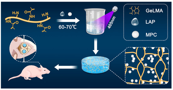 To sum up, we prepared a new GELMA-MPC composite (GMPC) by mixing MPC and GelMA hydrogels in different proportions, ensuring that the material retains its shape while promoting bone healing. In this study, we explored and analyzed the physical and chemical properties of the prepared GelMA and GMPC and demonstrated their biocompatibility and bone regeneration through in vitro and in vivo experiments with rat bone marrow mesenchymal stem cells (MSC), human umbilical vein vascular endothelial cells (HUVEC), and rat models (Figure 1).