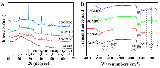 (A) The XRD spectra of GelMA: 2.5 GMPC, 5 GMPC and 7.5 GMPC. (B) FT-IR spectra of GelMA: 2.5 GMPC, 5 GMPC and 7.5 GMPC.