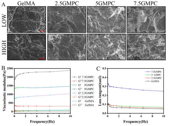 (A) SEM images of the sample were prepared. (B) Relation of storage modulus (G′) and loss modulus (G″) to GelMA: 2.5 GMPC, 5 GMPC and 7.5 GMPC frequencies. (C) The viscoelastic modulus of the sample is calculated and compiled to a loss tangent value. The red scale for low and high images is 500 μm and 50 μm respectively.