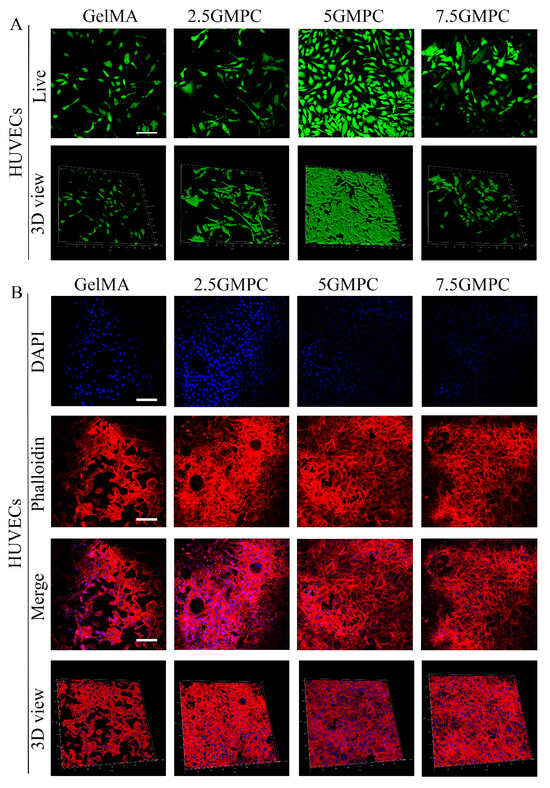 (A) The effect of GelMA and GMPC on HUVECs adhesion and proliferation. Staining was performed with live or dead staining: live cells were stained green and dead cells were stained red. (B) Phalloidine staining and DAPI staining: living and stationary cells are shown in blue.
