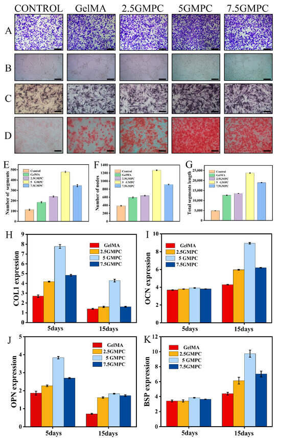 Transwell results of MSCs co-cultured with a composite extract are shown in Figure 5A. Experimental results of tube formation assay after 8 h co-culture of MSCs and material extract are shown in Figure 5B. The number of segments, nodes and total segments length are shown in the Figure 5E–G. Representative ARS staining of MSCs co-cultured for 21 days is shown in Figure 5D. Representative ALP staining of MSCs co-cultured for 15 days is shown in Figure 5C. In the above experiments, the result of 5 GMPC was significantly higher than that of other groups, and the results of GelMA and control group were similar. GMPCs can promote bone differentiation through gene expression of COL1, OPN, OCN and BSP (Figure 5H–K). These are genes involved in bone formation. In the results of 5 GMPC for 5 days, the expression of COL1 and OPN was 2.88 and 2.06 times that of the GelMA group, respectively. In the 5 GMPC group, OCN and BSP expression were considerably higher than other expressions at 15 days. On the other hand, gene expression in 7.5 GMPC and 2.5 GMPC tended to be similar to or slightly higher than that in the GelMA group.