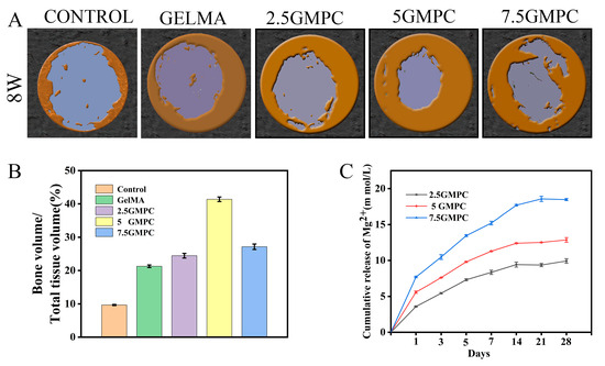 (A) Micro-CT analysis at 8 weeks post-implantation. Three-dimensional reconstructed micro-CT images of calvarial bone 8 weeks after implantation of control, GelMA and GMPC. (B) Quantitative analysis of bone volume fraction in total tissue volume (BV/TV, %) in each group. (C) Ion release of magnesium ions in the medium within 4 weeks.