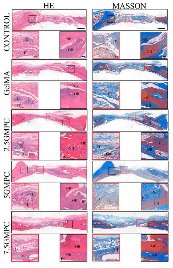 Histological analysis of defects at 8 weeks post-implantation. Representative images of histological sections in H&E stain, 8 weeks after implantation. Black-dotted line indicates the original edges of defects. Red-dotted line outlines regenerated bone. FT: fibrous tissue; G: GelMA; IN: inflammation; NB: newly formed bone; OB: original bone. The scale of the upper image is 500 µm and the scale of the enlarged image is 200 µm.