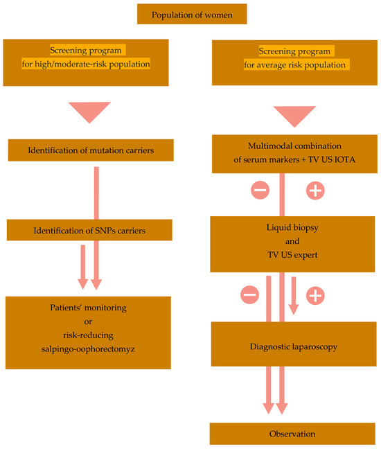“DEPHENCE” system in ovarian cancer diagnosis. The general population of women should be divided into the population with an increased risk (identified based on the higher incidence of cancer in family members, the incidence of ovarian/breast cancer in first/second-degree relatives, and positive familial history of genetic syndromes with increased risk of cancer) and the population with an average risk of ovarian cancer. The higher-risk population should be subjected to the identification of gene mutations and/or SNPs, increasing the risk of ovarian cancer occurrence. In the case of positivity, the risk-reducing salpingo-oophorectomy or serial monitoring should be offered after completing reproduction. According to IOTA rules, the average-risk population should be tested with a serial multimodal combination of serum markers and serial transvaginal ultrasound. In the case of the positivity of either marker levels or the presence of a suspected adnexal tumor, the next step should be performing a liquid biopsy and expert ultrasound, and, when positive, eventual diagnostic laparoscopy. Patients with negative results of marker tests or ultrasound are directed to observation and further screening (once a year?). The multimodal combination of serum markers, as well as targets for the liquid biopsy, should be chosen on the basis of high specificity and sensitivity for early-stage ovarian cancer, as advanced tumors are easily recognizable. TV US—transvaginal ultrasound; IOTA—International Ovarian Tumor Analysis group; ctDNA—circulating tumor DNA.