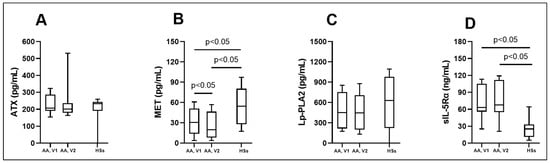 Serum levels of ATX (A), MET (B), Lp-PLA2 (C), and sIL-5Rα (D). AA—allergic asthma; ATX—autotaxin; HSs—healthy subjects; Lp-PLA2—lipoprotein-associated phospholipase A2; MET—tyrosine-protein kinase Met; sIL-5Rα—soluble interleukin 5 receptor subunit alpha; V1—experimental day; V2—experimental day—24 h after V1. Data are presented as the median with interquartile range. Statistical analysis: between investigated groups, Mann–Whitney two-sided U-test; within one study group, Wilcoxon matched-pair signed-rank two-sided test.