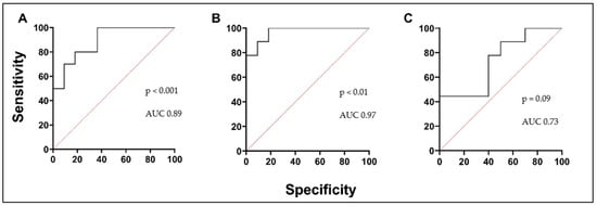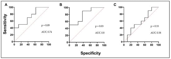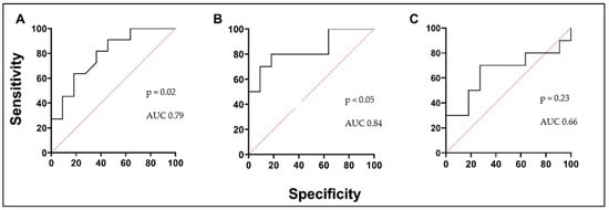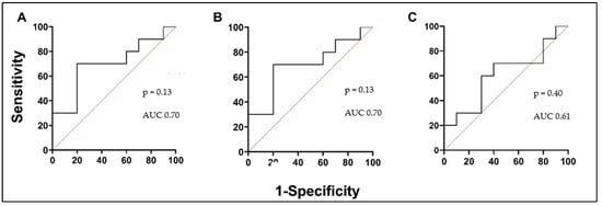 We investigated circulating PTX3 and TRX1 levels to predict oxidative stress in asthmatic patients’ serum and investigate them as a potential biomarker in asthma. A lower concentration of PTX3 was found in the AA group and was significantly different compared to the HS group. The PTX3 concentration in the AA group decreased 24 h after the BAC and was significantly lower compared to the concentration before the BAC (Figure 4A; Table 5). According to the ROC curve analysis, the AUC was 0.89, 0.97, and 0.73 (Figure 5A–C). In the AA group, serum levels of TRX1 were significantly higher than in the HSs. Moreover, concentrations were significantly elevated in the AA group 24 h after the BAC, compared to the results before the BAC (Figure 4B; Table 5). According to the ROC curve analysis, the AUC was 0.7, 0.7, and 0.61 (Figure 6A–C).