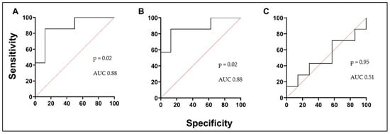 PTX3 ROC curves. (A) AA V1 vs. HSs; (B) AA V2 vs. HSs; (C) AA V1 vs. AA V2. AUC—area under the curve.