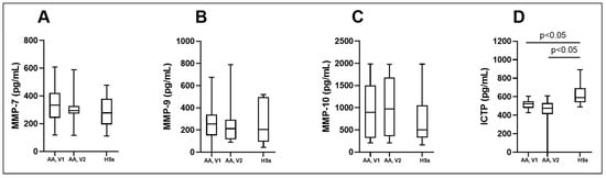 Serum levels of MMP-7 (A), MMP-9 (B), MMP-10 (C), and ICTP (D). AA—allergic asthma; HSs—healthy subjects; ICTP—I C-telopeptide of type I collagen; MMP-7—matrix metalloproteinase-7; MMP-9—matrix metalloproteinase-9; MMP-10—matrix metalloproteinase-10; V1—experimental day; V2—experimental day—24 h after V1. Data are presented as the median with interquartile range. Statistical analysis: between investigated groups, Mann–Whitney two-sided U-test; within one study group, Wilcoxon matched-pair signed-rank two-sided test.