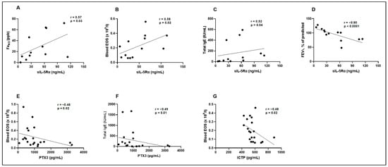 Correlations between sIL-5Rα and FeNO (A), sIL-5Rα and blood EOS (B), sIL-5Rα and total IgE (C), sIL-5Rα and FEV1 (D), PTX3 and blood EOS (E), PTX3 and total IgE (F), ICTP and blood EOS (G). EOS—eosinophil; FeNO—fractional exhaled nitric oxide; FEV1—forced expiratory volume in 1 s; ICTP—I C-telopeptide of type I collagen; IgE—immunoglobulin E; sIL-5Rα—soluble interleukin 5 receptor subunit alpha; TRX1—thioredoxin 1; PTX3—pentraxin 3; r—correlation coefficient. Statistical analysis: Spearman’s rank correlation.