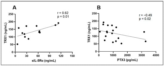 Correlations between sIL-5Rα and TRX1 (A), PTX3, and TRX1 (B). sIL-5Rα—soluble interleukin 5 receptor subunit alpha; TRX1—thioredoxin 1; PTX3—pentraxin 3; r—correlation coefficient.