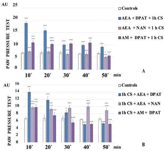 CB1- or 5HT1A-antagonization before (A) and after (B) stress exposure—effect on 1 h cold-SIA. Pain thresholds are presented as mean values ± S.E.M. in arbitrary units (AU). *** p < 0.001, * p < 0.05 vs. controls; +++ p < 0.001 vs. AEA+DPAT+1 h CS (A)/1 h CS+AEA+DPAT (B). AEA—exogenously administered anandamide; DPAT—5-HT1A-agonist; NAN—5-HT1A-antagonist; AM—CB1-antagonist; 1 h CS—1 h of cold stress.