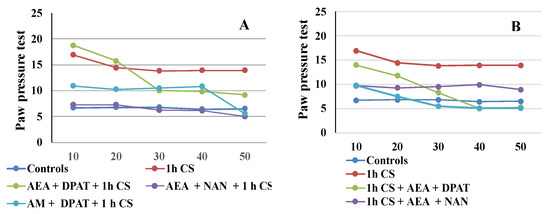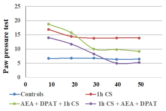 The administration of the CB1 agonist AEA together with the 5HT1A-antagonist NAN before exposure to stress completely abolished the development of c-SIA. The obtained results showed that the PPT of the experimental animals were similar to the controls and even showed a tendency towards hyperalgesia at the 50th minute of the experiment (AEA+NAN+1 h CS, Figure 2A).