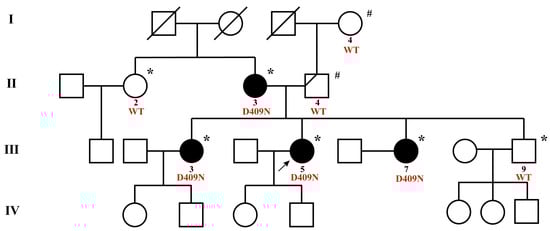 The pedigree of the FNMTC family. Squares represent males, and circles represent females. Filled circles and squares represent diagnosed PTC patients. Short diagonal lines represent patients with thyroid nodules, and long diagonal lines represent deceased members. The black arrow points to the FNMTC family proband. Subjects participating in this study are labeled with numbers. * denotes subjects analyzed by whole-exome sequencing; # denotes subjects analyzed by Sanger sequencing. “WT” stands for Wide Type, PPP4R3A wild type gene; “D409N” marks family members carrying the p.(Asp409Asn) mutation in the PPP4R3A gene.