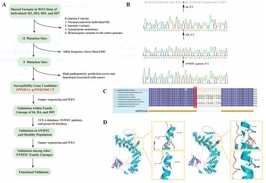 To validate whether the candidate gene PPP4R3A Asp409Asn mutation conforms to the basic inheritance pattern of FNMTC, we performed validations within the family, between families, in sporadic thyroid cancer cases, and the healthy population, following the gene mapping strategy outlined in Figure 2A. For this particular family, we conducted intrafamilial validation on members I 4, II 4, and III 9. Genomic DNA fragments of I 4 and II 4 were amplified through PCR and validated using Sanger sequencing, while WES data was directly searched for III 9. Sanger sequencing results revealed that both I 4 and II 4 were wild type (Figure 2B). A comprehensive search for the PPP4R3A Asp409Asn mutation in the WES data of member III 9 yielded no results. Thus, we concluded that mutant PPP4R3A: g.91942196C>T segregates with the gene and phenotype in this family (Figure 1).