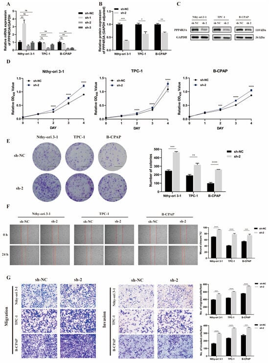 The effects of stable PPP4R3A knockdown in three thyroid cell lines (Nthy-ori 3–1, TPC-1, B-CPAP). (A) Quantitative RT-PCR analysis to validate the knockdown efficiency of PPP4R3A using shRNAs (sh-1, sh-2, and sh-3); (B,C) Validation of one specific shRNA (sh-2) targeting PPP4R3A protein expression in three different cell lines using Western blots. GAPDH was used as an internal control. Quantification data represent mean ± SD for three independent experiments. Supplementary material provides duplicate results; (D) CCK8 assay measured the growth of Nthy-ori 3–1, TPC-1, and B-CPAP cells treated with the control shRNA(sh-NC) and shPPP4R3A (sh-2), respectively, over a five-point time course; (E) Colony formation assay was carried out to evaluate the cellular colony-forming ability. The right panel shows quantification data. (Scale bars, 1 cm); (F) Wound healing assay to detect cell migration ability. The right panel presents quantification data; (G) Transwell migration and invasion assays to determine the migration and invasion ability of three thyroid cell lines, respectively (zoom 100×). The right panel provides quantification data. Error bars indicate standard deviation. Statistical significance is denoted as * p < 0.05, ** p < 0.01, *** p < 0.005, **** p < 0.001.