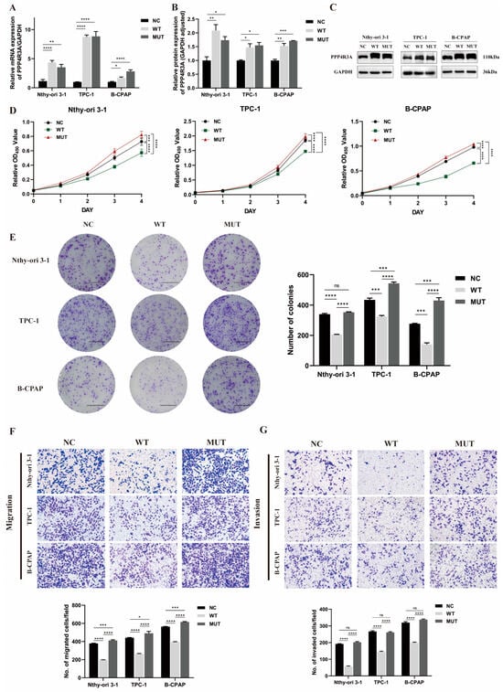 The effects of stable overexpression of wild-type PPP4R3A and the p. Asp409Asn variant in three thyroid cell lines (Nthy-ori 3-1, TPC-1, B-CPAP). (A) Quantitative RT-PCR analysis to validate the stable overexpression of wild-type (WT) and Asp409Asn mutant PPP4R3A (MUT) using lentivirus transfection in three different cell lines; (B,C) Western blot to detect protein overexpression of WT and MUT PPP4R3A, with GAPDH serving as an internal control. Quantification data represent mean ± SD. for three independent experiments. Supplementary material provides duplicate results; (D) CCK8 assay to measure the growth of Nthy-ori 3–1, TPC-1, B-CPAP cells infected with empty vector (NC), WT, and MUT lentivirus, respectively, over a five-point time course; (E) Colony formation assay to evaluate the cellular colony-forming ability. The right panel shows quantification data. (Scale bars, 1 cm.); (F) Transwell migration assay to detect the migration ability of three thyroid cell lines (zoom 100×). The lower panel presents quantification data; (G) Transwell invasion assay to determine the invasion ability of three thyroid cell lines (zoom 100×), with the lower panel presenting quantification data. Error bars indicate standard deviation. Statistical significance is denoted as * p < 0.05, ** p < 0.01, *** p < 0.005, **** p < 0.001.