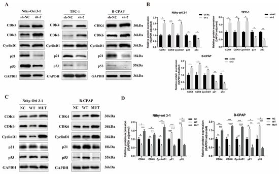 Impact of PPP4R3A and p. Asp409Asn variant on cell cycle-associated protein expression in thyroid cell lines. (A,B) Western blot analysis depicting the levels of cell cycle-related proteins in three thyroid cell lines (Nthy-ori 3-1, TPC-1, B-CPAP) treated with control shRNA (sh-NC) and shPPP4R3A (sh-2). Quantification data are presented as mean ± SD for three independent experiments, normalized to the internal expression of GAPDH; (C,D) Western blot analysis illustrating the levels of cell cycle proteins in normal thyroid cell line Nthy-ori 3-1 and the PTC cell line B-CPAP overexpressing wild-type (WT) and mutant (MUT) PPP4R3A. Quantification data are shown as mean ± S.D. for three independent experiments. Supplementary material provides duplicate results. Error bars represent standard deviation. * p < 0.05, ** p < 0.01, *** p < 0.005, **** p < 0.001.