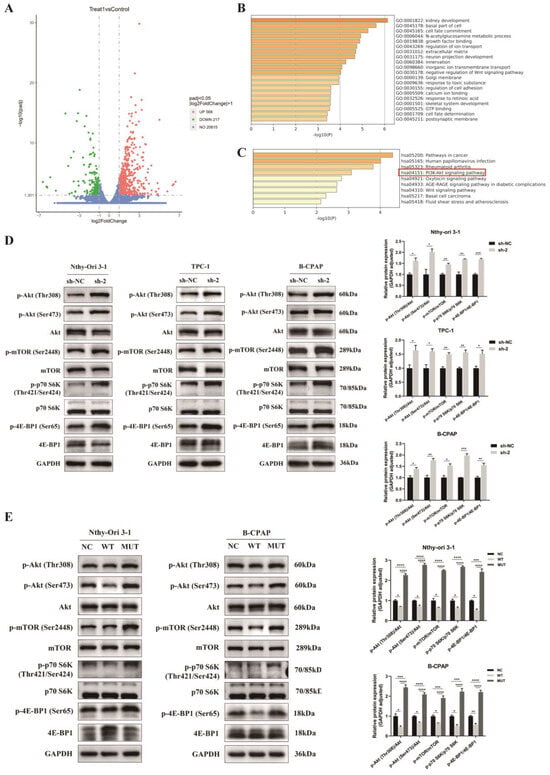 To elucidate the mechanisms underlying the tumor-suppressive effect of PPP4R3A in thyroid cancer, we conducted transcriptome sequencing to identify the downstream pathways regulated by PPP4R3A. The knockdown of PPP4R3A in TPC-1 cells resulted in significant RNA-level upregulation of 568 genes and downregulation of 217 genes (Figure 6A). GO enrichment analysis revealed the involvement of these differentially expressed genes (DEGs) in various tumor-related processes, including cell adhesion, cell fate determination and commitment, calcium ion binding, and negative regulation of the Wnt signaling pathway (Figure 6B), highlighting the crucial role of PPP4R3A in thyroid cancer development. KEGG pathway analysis of the DEGs demonstrated a close association between PPP4R3A and cancer signaling pathways, particularly PI3K/Akt (Figure 6C). Considering the significance of the PI3K/Akt pathway in FNMTC progression and its potential relationship with invasiveness [], we hypothesize that PPP4R3A regulates thyroid cancer development through this pathway.