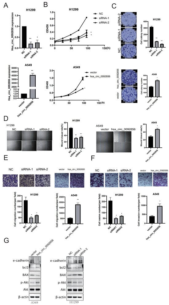 Based on the results from Figure 1, we conducted functional experiments of hsa_circ_0092856 by knocking down and overexpressing it in H1299 and A549 cell lines, respectively; hsa_circ_0092856 can be significantly knocked down or overexpressed (Figure 2A). The effects of hsa_circ_0092856 on the proliferation, migration, and invasion of NSCLC cells were analyzed in a CCK-8 experiment, a colony formation experiment, a wound-healing experiment, and a transwell chamber experiment. The CCK-8 and colony formation assay showed that hsa_circ_0092856 knockdown inhibited the growth and colony formation of H1299 cells, while hsa_circ_0092856 overexpression promoted the growth and colony formation of A549 cells (Figure 2B,C). The wound-healing test and transwell chamber test showed that hsa_circ_0092856 knockdown could inhibit the migration of H1299 cells, while hsa_circ_0092856 overexpression could promote the migration of A549 cells (Figure 2D,E). The transwell chamber test showed that hsa_circ_0092856 knockdown could inhibit the invasion of H1299 cells, while hsa_circ_0092856 overexpression could promote the invasion of A549 cells (Figure 2F). The Western blot test showed that has_circ_0092856 knockdown could inhibit the protein level of p-Akt and bcl2 and elevate the protein level of BAX and e-cadherin; has_circ_0092856 overexpression is the opposite. The above results showed that hsa_circ_0092856 enhanced the proliferation, migration, and invasion of NSCLC cells.