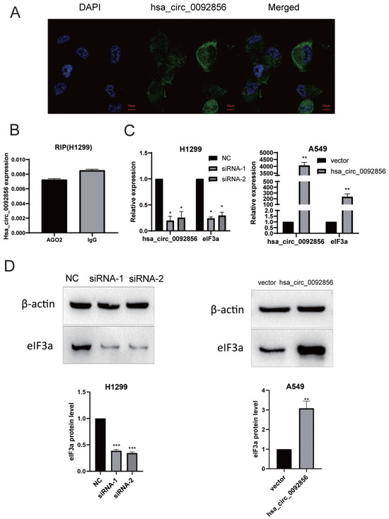 Possible biological functions of has_circ_0092856. (A) The subcellular localization of hsa_circ_0092856 was detected via RNA fluorescence in situ hybridization (FISH). (B) Verification of miRNA sponge function of hsa_circ_0092856 via RIP. (C,D) The hsa_circ_0092856 was knocked down and overexpressed in the two cell lines, respectively, and the changes in the mRNA and protein levels of the parental gene eIF3a were detected. β-actin was a reference gene; * p < 0.05, ** p < 0.01 and *** p < 0.001 compared with NC group; n = 3.
