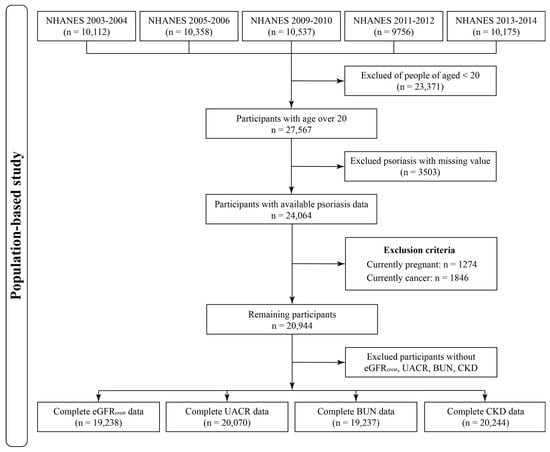 Self-reported psoriasis was defined through questionnaires. Participants who answered “Yes” to “have ever been told by a doctor or other health care professional that they had psoriasis” were considered a psoriasis patient. Quality of the interview and data input process was promised by a computer-assisted personal interviewing system [20]. Three continuous renal functions were derived from NHANES laboratory data as dependent variables: estimated glomerular filtration rate (eGFR) based on creatinine levels, urine albumin to creatinine ratio (UACR), and blood urea nitrogen (BUN). Of note, eGFR was calculated by the Chronic Kidney Disease Epidemiology Collaboration (CKD-EPI) equation [21]. We further defined CKD by an eGFR ≤ 60 mL/min per 1.73 m2 or UACR ≥ 30.0 mg/g, as a dichotomous outcome [22,23].
