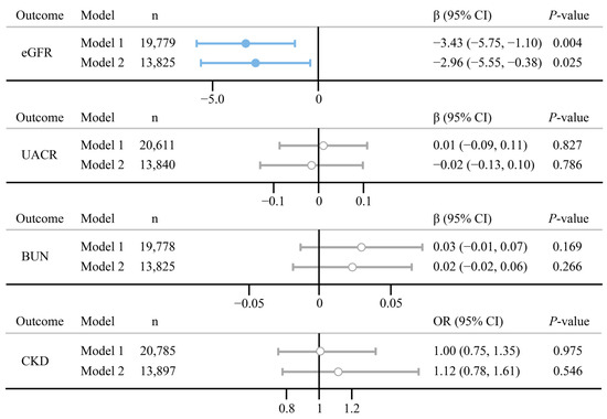 Estimates and the 95% confidence interval (CI) were used to assess the relationship between psoriasis and three continuous renal functions, whereas odds ratio (OR) and 95% CI were used for binomial outcomes. Figure 2 depicts the results of GLM. In the fully adjusted model, there were negative relationships between psoriasis and eGFR (estimate (95% CI): −2.96 (−5.55, −0.38), p = 0.025). No significant associations were found in psoriasis on three other renal functions (p > 0.05). The Wald test showed an interaction between psoriasis and BMI in the relationship of psoriasis on BUN (Pint = 0.018), indicating the effect of psoriasis on BUN may be influenced by BMI (Figure S3).