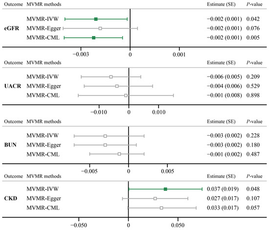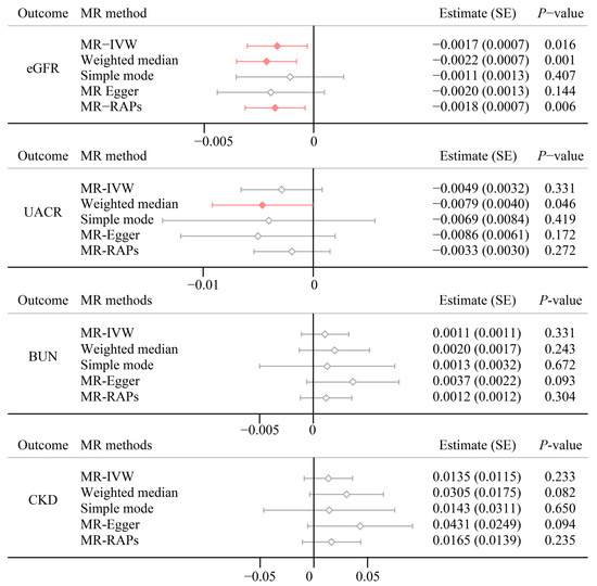 Multi MR method results for psoriasis on renal function. eGFR, estimated glomerular filtration rate based on creatinine levels; UACR, urine albumin to creatinine ratio; BUN, blood urea nitrogen.