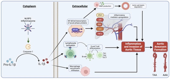 As previously discussed, the pathogenesis of aortic aneurysm formation is both complex and multifactorial. Generalized destruction of elastin and collagen in the aortic media and adventitia, VSMC loss, and the infiltration of lymphocytes and macrophages are all pathophysiologic mechanisms that propagate aneurysm formation [11]. Dysregulation of the physiologic process of inflammation is considered a key contributing upstream mechanism of AA formation. Activated macrophage and pro-inflammatory CD4 T-cell infiltration has been linked to aneurysm formation and rupture in murine models [11,19]. This process is driven by several inflammatory mediators which have been linked to cardiovascular diseases, including IL-1β, the NLRP3 inflammasome, NF-Kβ, and IL-6. We aim to introduce the intricate connection among dysregulation of these inflammatory mediators, ROS signaling, and AA formation.