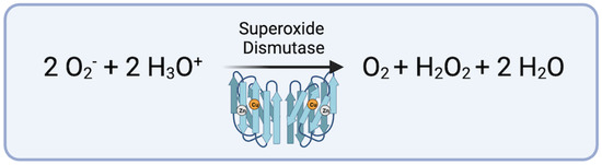 Conversion of superoxide anions via superoxide dismutase with cofactors Cu2+and Zn2+ (figure generated via biorender.com, accessed 1 November 2023).