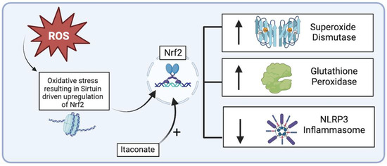Sirtuin-driven Nrf2 upregulation of endogenous antioxidant systems and downregulation of NLRP3 inflammasome (figure generated via biorender.com, accessed 1 November 2023).