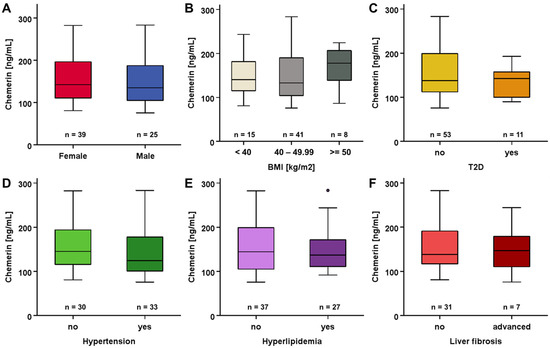 Figure 2. Pre-surgery systemic chemerin concentrations were elevated in female RYGB patients (A), whereas BMI, hypertension, T2D, hyperlipidemia, and liver fibrosis had no effect (BF).