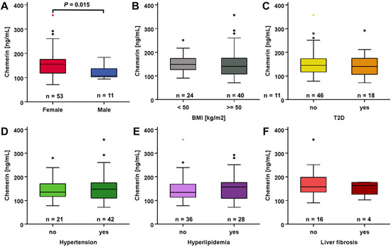 Among patients being allocated to RYGB surgery, females exhibited higher baseline systemic chemerin levels (158.7 ng/mL) compared to males (121.0 ng/mL) (Figure 2A). BMI, T2D, hypertension, hyperlipidemia, and liver fibrosis apparently did not significantly affect chemerin quantities (Figure 2B–F).