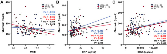 Regarding the whole study cohort (n = 128), serum chemerin quantities were negatively correlated with the waist–hip ratio (rho = −0.209, p = 0.024) and positively correlated with CRP (rho = 0.298, p = 0.001) and CCL5 levels (rho = 0.247, p = 0.005) (Figure 3).