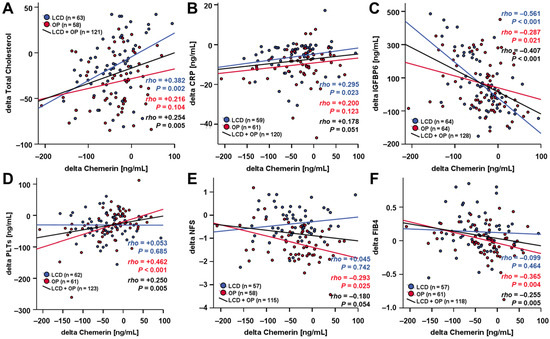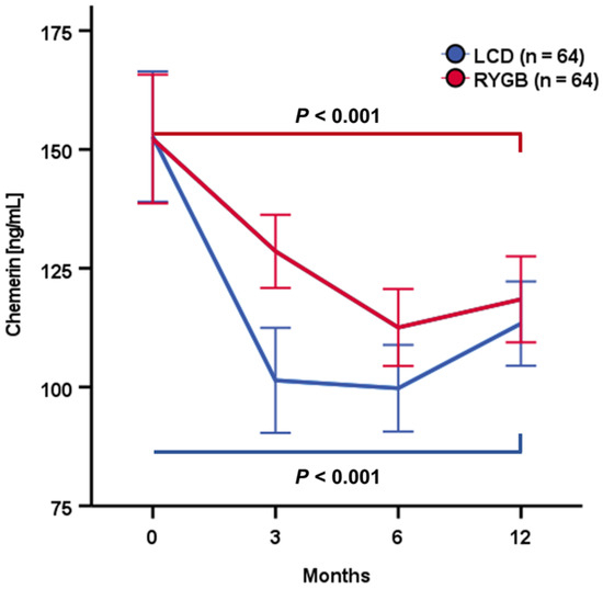 Among patients attending the LCD program, we detected positive correlations of serum chemerin kinetics with changes in the total cholesterol and CRP level within the 12-month study period. This finding suggests an association of decreasing chemerin quantities with a reduction in circulating total cholesterol and CRP—hence, with an amelioration of the systemic metabolic and inflammatory state—that might be more pronounced during weight loss induced by caloric restriction than by bariatric surgery. A substantial negative correlation between the kinetics of chemerin and IGFBP6 levels was predominantly detected among LCD patients. Since elevated IGFBP6 concentrations are considered to be associated with hepatic steatosis [31], this observation might imply a rather inverse correlation between weight loss-associated chemerin decline and improvement in hepatic metabolism, especially under caloric restriction—whereas chemerin concentrations at study baseline were not predictive for LCD-induced subsequent improvement in hepatic fibrosis, as was mentioned above.