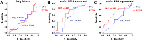 Figure 5. ROC analysis of the predictive potency of baseline chemerin levels for beneficial changes in body fat percentage (A), NFS (B), and FIB4 (C) during weight loss in LCD and RYGB patients.