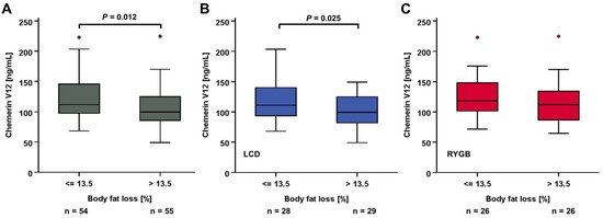 A further subgroup analysis comparing patients with differentially pronounced losses in body fat percentage (=<13.5% or >13.5%) revealed lower chemerin serum concentrations after 12 months among those individuals with higher fat loss (Figure 7A). Of note, this significant difference was exclusively observed among patients receiving LCD therapy but not among those having undergone RYGB surgery (Figure 7B,C).