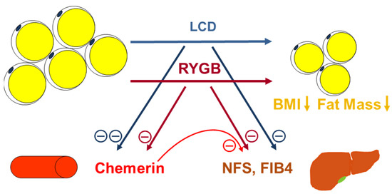 Figure 8. Circulating chemerin concentrations significantly decline during therapy-induced loss of body weight, BMI, and fat mass. The downregulation appears to be more pronounced under LCD than after RYGB surgery. Furthermore, reductions in body weight and fat mass are partially accompanied by a decrease in NFS [32] and FIB4 values, indicating reduced liver fibrosis risk. These changes in NFS and FIB4 during RYGB-induced weight loss are negatively correlated with chemerin kinetics, suggesting the hypothesis of chemerin being involved in the process of hepatic amelioration during post-surgical weight loss.