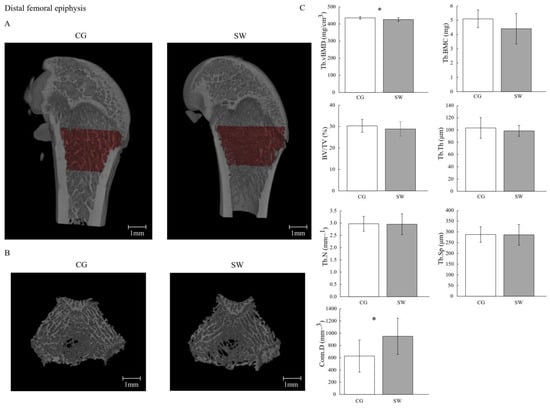 Trabecular mass and microarchitecture at distal femoral epiphysis in growing rats between the control (n = 10, except for trabeculae connectivity density n = 9 after removing the outliers) and swimming groups (n = 9, except for trabeculae connectivity density n = 7 after removing the outliers) after eight months of the experiment (C), with the representative micro-computed tomography images of the sagittal (A) and transverse planes (B). Data are displayed as mean ± SD. Legend: Active control group (CG); bone volume fraction (BV/TV); trabeculae connectivity density (Conn.D); trabecular bone mineral content (Tb.BMC); trabecular number (Tb.N); trabecular thickness (Tb.Th); trabecular separation (Tb.Sp); trabecular volumetric bone density (Tb.vBMD); * p < 0.05.