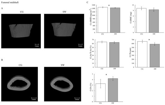 Cortical mass and microarchitecture at the femoral midshaft in growing rats between the control (n = 10, except for cortical porosity n = 9 after removing the outliers) and swimming (n = 9, except for cortical porosity n = 8 after removing the outliers) groups after eight months of the experiment (C), with the representative micro-computed tomography images of the sagittal (A) and transverse planes (B). Data are displayed as mean ± SD. Legend: Active control group (CG); cortical area fraction (Ct.Ar/Tt.Ar); cortical bone mineral content (Ct.BMC); cortical porosity (Ct.Po); cortical thickness cortical (Ct.Th); volumetric bone density (Ct.vBMD); swimming group (SW); * p < 0.05.