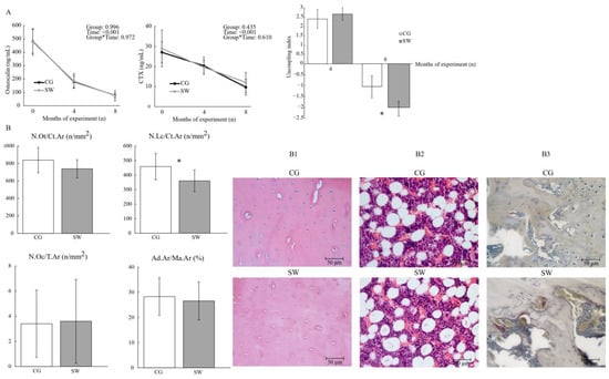 Bone turnover assessed by the biochemical markers and bone turnover uncoupling index (A) and femur osteocyte, lacunae, and osteoclast densities (B) between the control (n = 10) and swimming (n = 9) groups after eight months of the experiment, with representative images of haematoxylin and eosin staining for osteocyte, lacunae densities (B1), and bone marrow adiposity (B2), and tartrate-resistant acid phosphatase staining for osteoclast density (B3). Data are displayed as mean ± SD. Legend: Active control group (CG); bone marrow adiposity (Ad.Ar/Ma.Ar); C-terminal telopeptide of type I collagen (CTX); empty lacunae density (N.Lc/Ct.Ar); osteocyte density (N.Ot/Ct.Ar); osteoclast density (N.Oc/T.Ar); swimming group (SW); * p < 0.05.