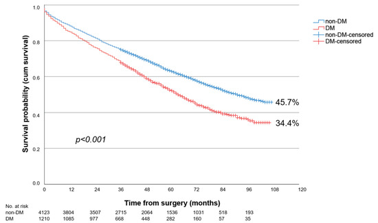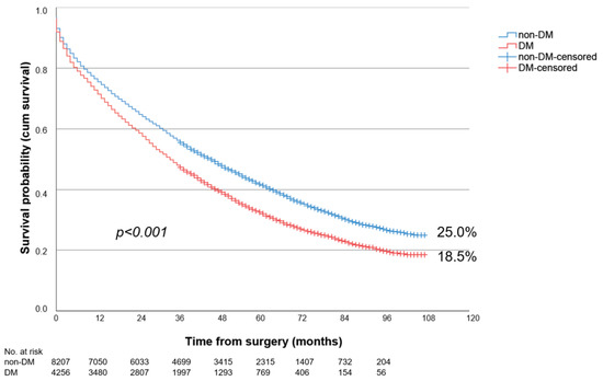 Overall, patients with PAD stage III showed the significantly better long-term survival over 9-year follow-up compared to patients with PAD stage IV (43.2% vs. 22.7%; p < 0.001). The long-term survival of DM patients was significantly worse, at 21.5%, compared to non-DM, at 31.1% (p < 0.001). This was true for both PAD stage III (DM: 34.4% vs. non-DM: 45.7%; p < 0.001) (Figure 1) and PAD stage IV (DM: 18.5% vs. non-DM: 25.0%; p < 0.001) (Figure 2).